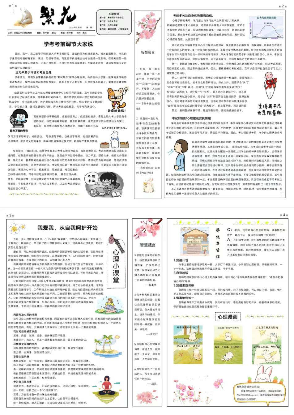 “繁花”月刊,为“心”守护。为科普心理健康知识,学校心理组老师分年级精心制作了“繁花”心理月刊,内容分别涉及“考前心理调节、五月心理健康月活动普及、心理漫画、应对挫折小技巧”等方面,发放到每个班级的图书角,随时供全体师生学习,受到广大师生的热烈欢迎。