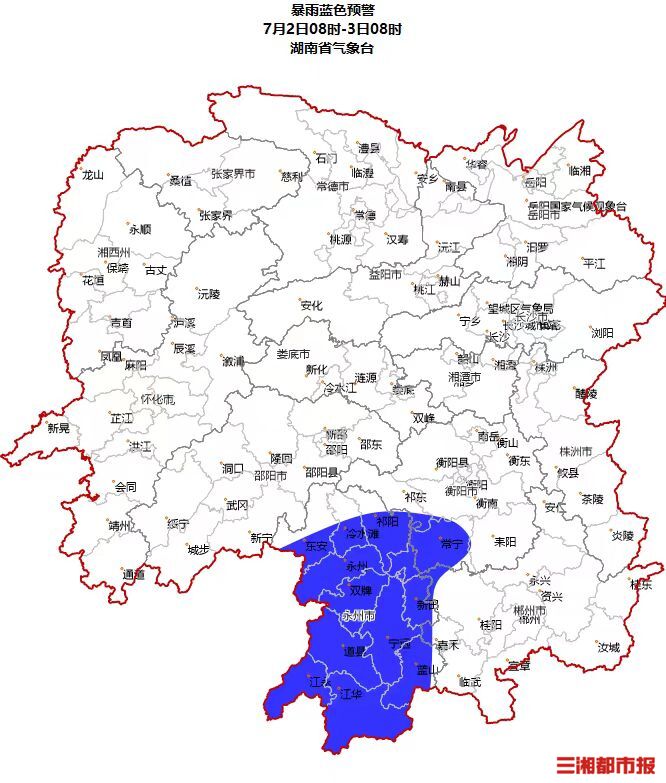 三湘都市报·新湖南客户端7月2日讯(全媒体见习记者 李致远)湖南省气象台7月2日6时发布暴雨蓝色预警:预计2日8时至3日8时,衡阳南部、永州将出现暴雨,并伴有短时强降水、雷雨大风等强对流天气,请加强防范。