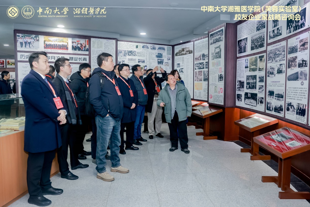 会前,校友企业家们参观了在湘雅新校区的湘雅公共卫生学院、湘雅护理学院、湘雅药学院、生命科学学院及湘雅医学院院史馆,参观了湘雅老校区芙蓉实验室核心区。四名校友代表向老校区颜福庆、张孝骞雕像敬献了鲜花,并献上了寄托全体湘雅校友情谊的红围巾。