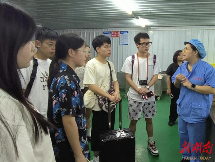 “蛮味”食品加工厂工作人员为团队成员讲解生产流程