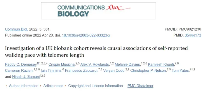2022 年,《自然》期刊旗下《通讯-生物学》杂志上也发表了一项走路速度与衰老指标“细胞端粒长度”之间的关系。研究收集了超过 40 万人的数据发现:与走路速度慢的人相比,走路速度快的人其细胞端粒长度明显更长,意味着走路慢的人身体实际衰老更严重,而走路快的人身体实际状态则更加年轻。