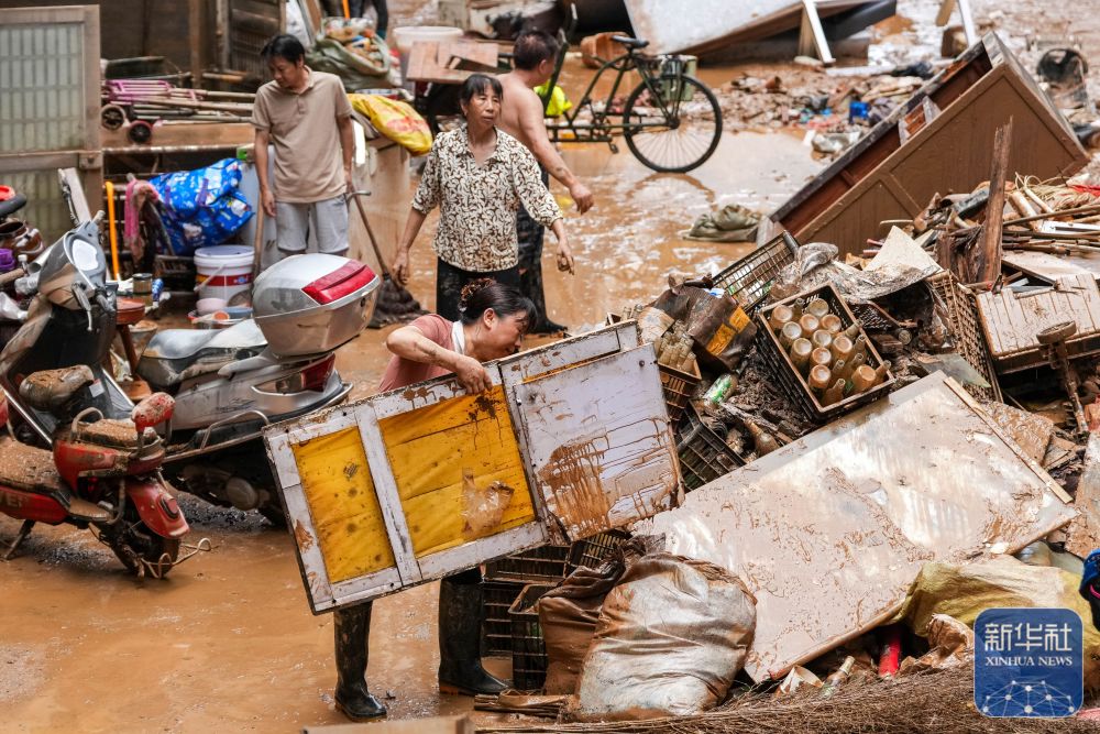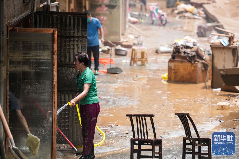 7月3日,在平江县新村路附近,群众在清扫房屋。