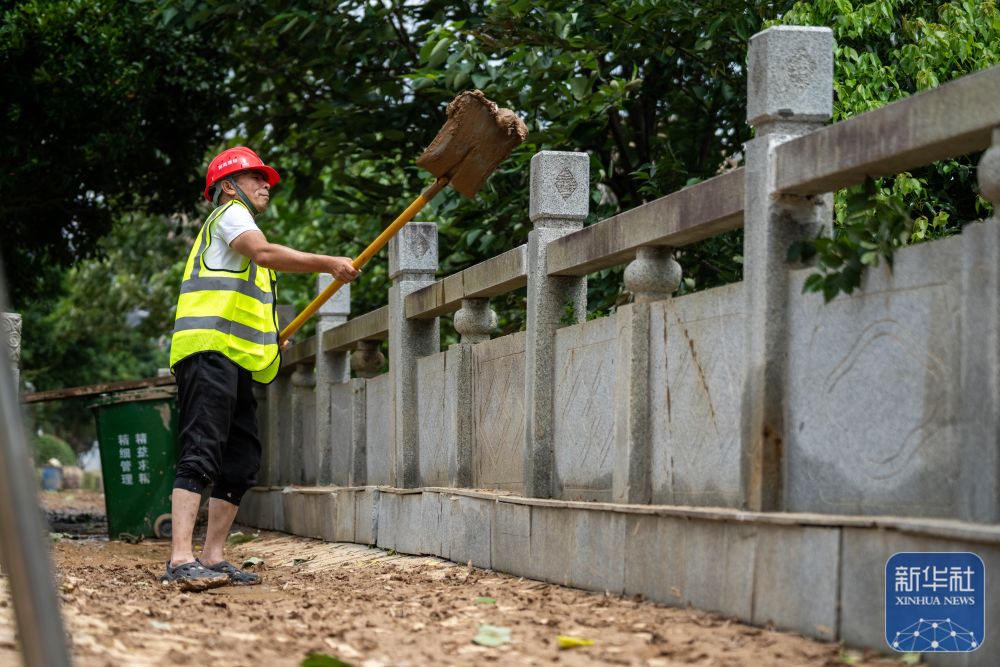 7月3日,在平江县曲池路,湖南省第二工程有限公司建筑工人在工地附近开展清淤工作。新华社记者 陈思汗 摄