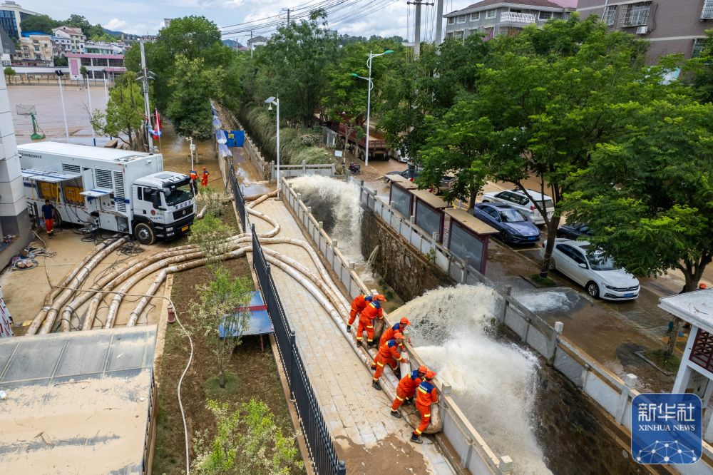 7月3日,在平江县金财花园小区,中国安能武汉救援基地应急保障分队队员在进行排涝工作。新华社记者 陈思汗 摄