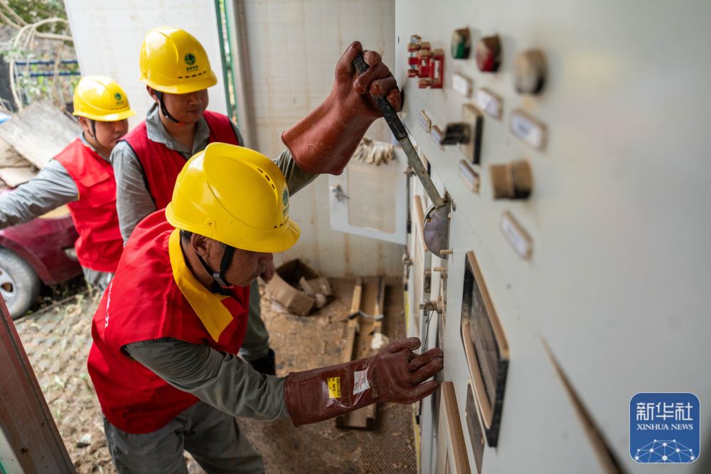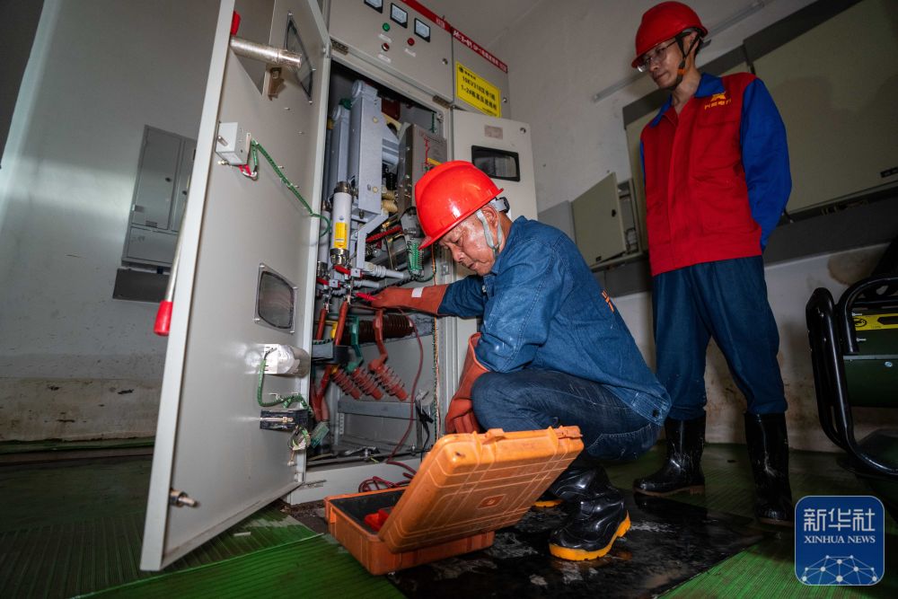 7月3日,在平江县天力城小区配电房,国网长沙供电公司电力工人在进行绝缘实验。新华社记者 陈思汗 摄