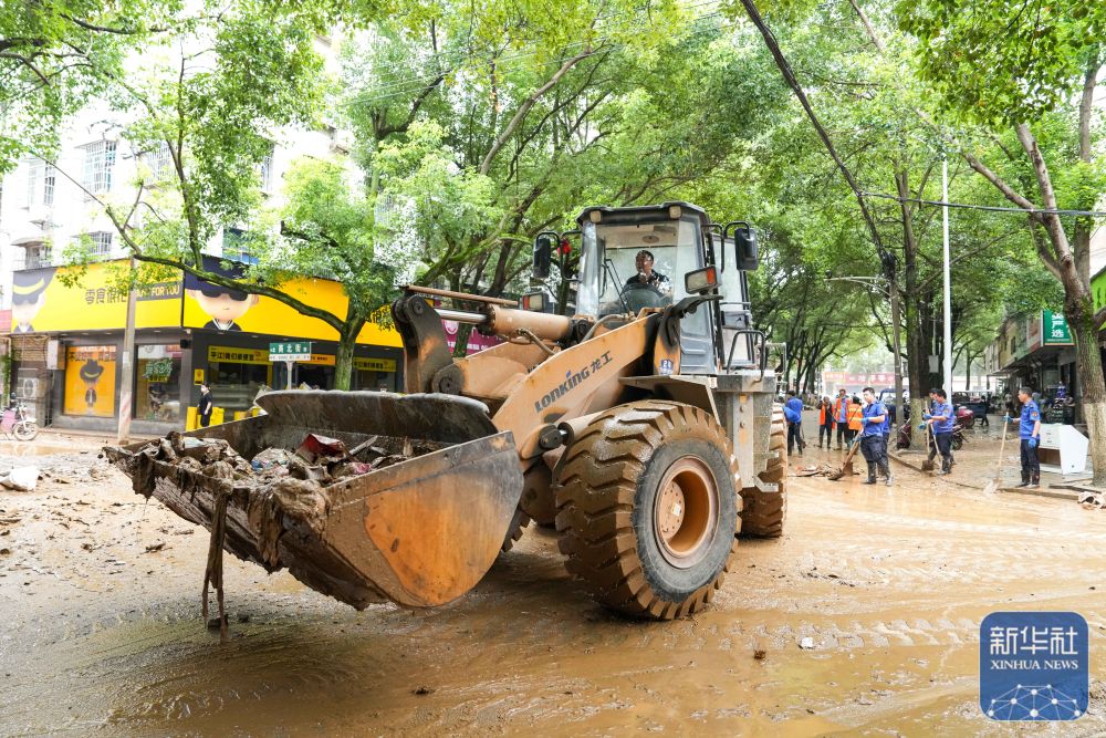 7月3日,在平江县商北街,铲车在进行道路疏通工作。