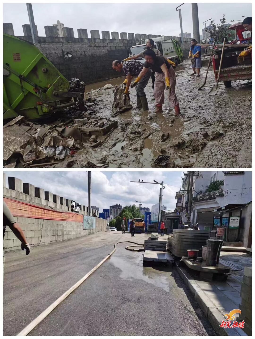 在每一个防洪区,干部职工、消防、民兵等工作人员分工协作、各司其职、密切配合,先用铁锹将地面的顽固淤泥铲走,再用高压水枪进行大面积冲洗,最后用扫帚将残留垃圾和杂物清理。在工作人员的共同努力下,路面的淤泥被一点点地清理干净。