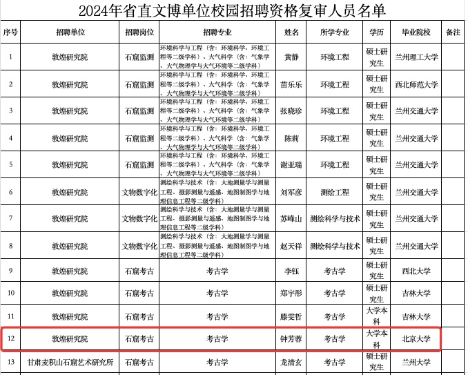 澎湃新闻注意到,今年6月下旬,敦煌研究院发布了《关于2024年省直文博单位校园招聘资格复审及面试的通知》。该通知提到:2024年省直文博单位校园招聘网上报名及资格初审已完成,按照工作程序,现对拟进入面试的应聘人员进行资格复审(名单见附件)。复试名单显示,北大考古学专业本科毕业生钟芳蓉应聘的为敦煌研究院的石窟考古岗位。