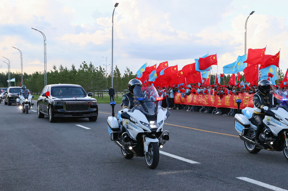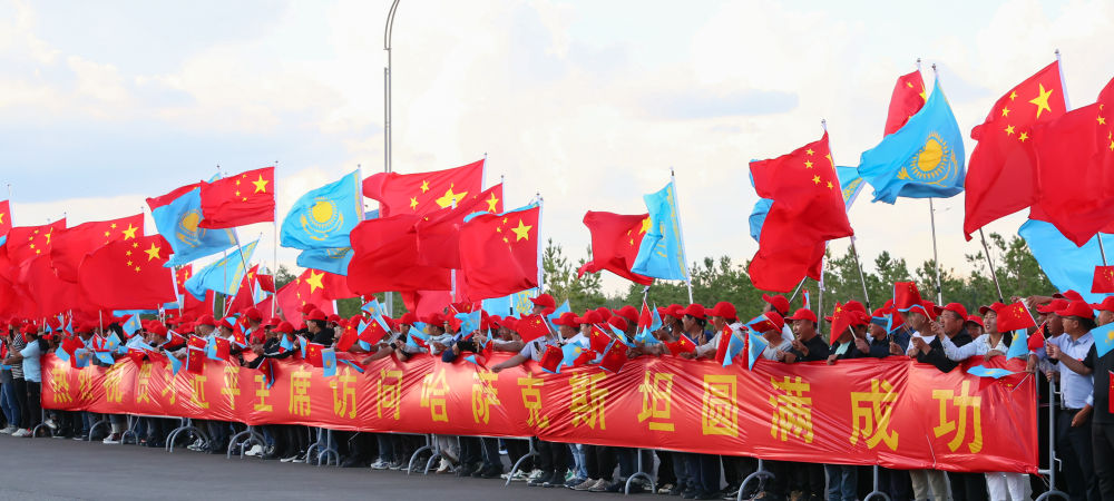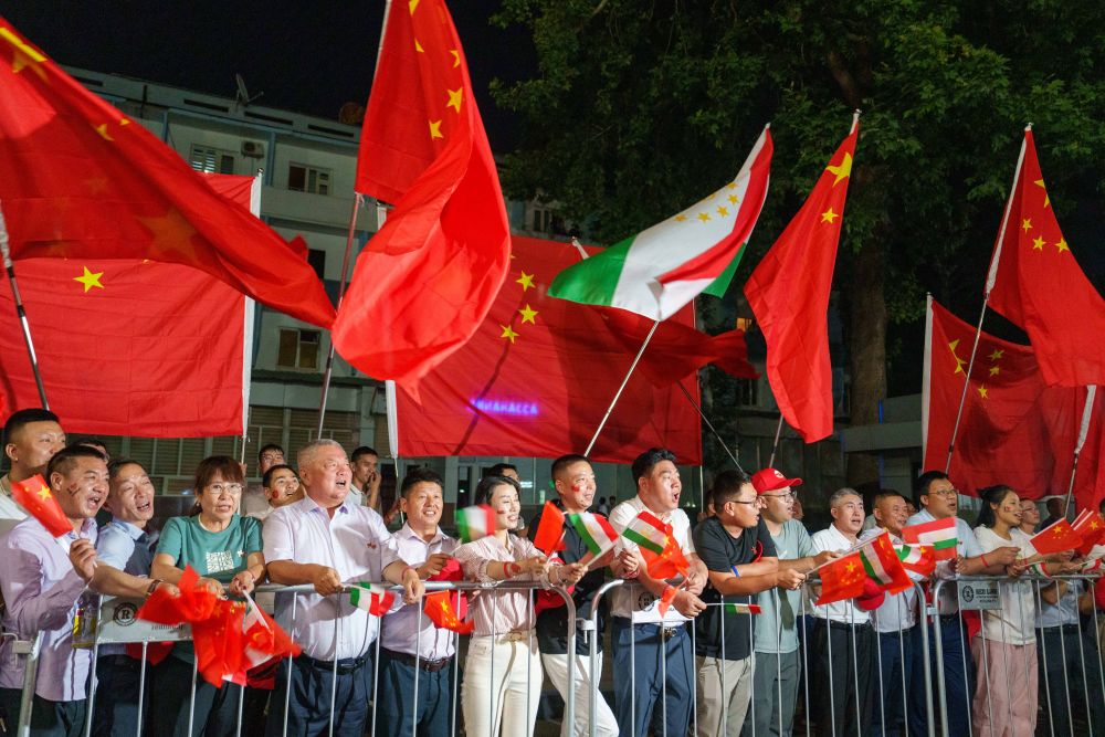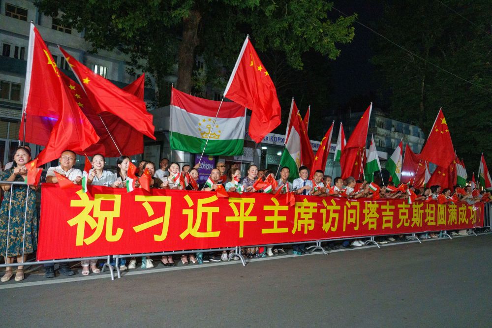 习近平乘车从机场赴下榻饭店途中,中塔两国国旗迎风飘扬,当地华侨华人和中资机构代表列队挥舞中塔两国国旗,热烈欢迎习近平访问塔吉克斯坦。