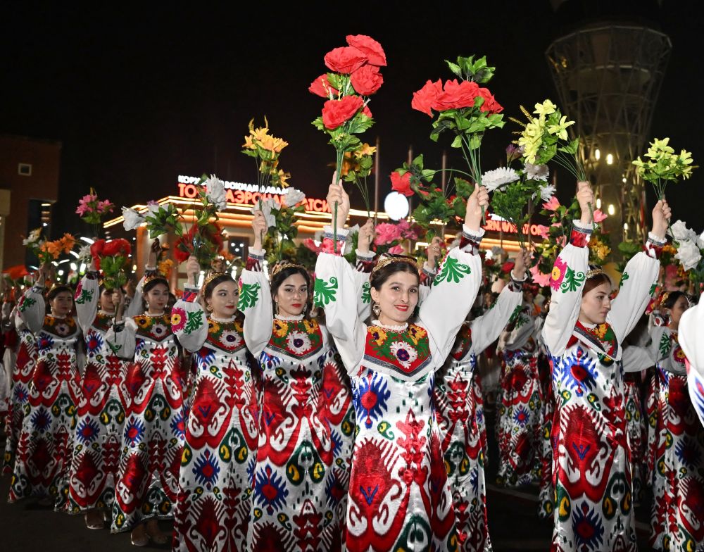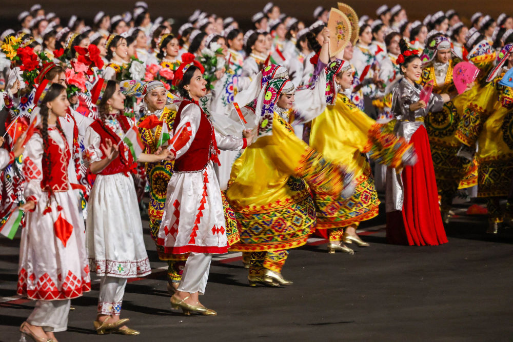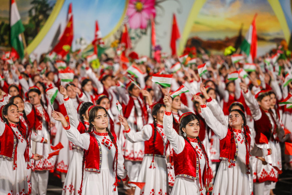 拉赫蒙在机场为习近平举行盛大隆重的迎宾仪式。1500多名身着民族盛装的塔吉克斯坦青年表演富有浓郁特色的中塔歌舞,挥舞中塔两国国旗,表达对中国最尊贵客人的热烈欢迎。