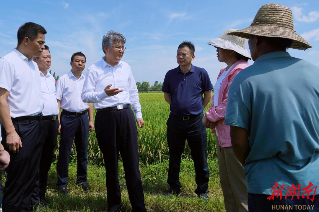 (7月5日上午,省委副书记李殿勋在湘潭县石潭镇调研省级粮食生产万亩综合示范片生产情况。)