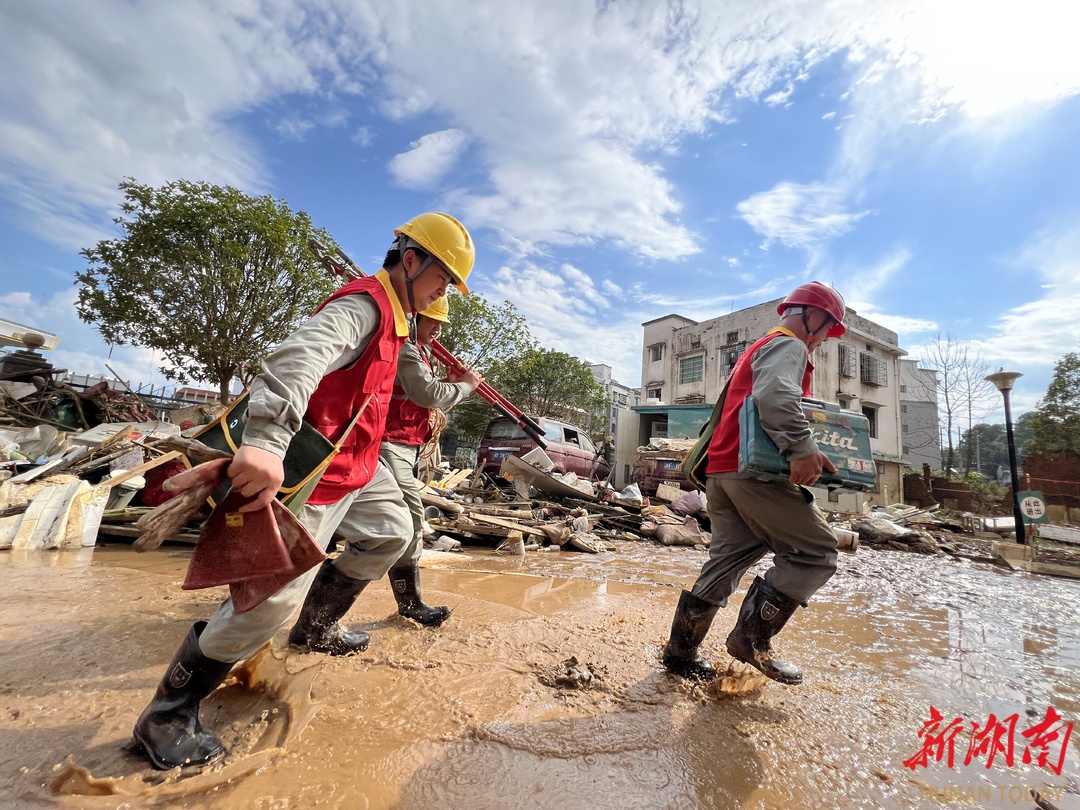 泡在淤泥里也要送上电!7月3日凌晨,天刚蒙蒙亮,平江的洪水尚未完全退却,国网东方红(电骏马)共产党员突击队队长段振锋立即带领队员赶往10千伏画秀线开展故障排查和抢修。作业环境遍地超过二十公分的淤泥,雨后的平江格外闷热,毒辣的太阳“炙烤”着突击队员们,队友们顾不上满地淤泥和杂物,细致排查线路,累计处置隐患20余处,中午12时完成10千伏画秀线主线供电,21时完成全线复电。