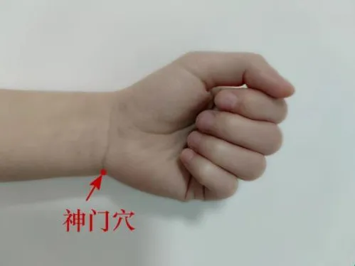 属手少阴心经。位于腕横纹尺侧端,尺侧腕屈肌腱的凹陷处。在腕关节的掌侧,小指末端延伸可摸到一突起圆骨,该圆骨下方凹陷处按压有酸胀感即为此穴。神门可泻火除烦,宁心安神,是治疗心受邪扰的重要穴位。