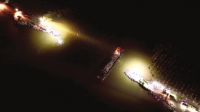 7月7日晚,华容县团洲垸洞庭湖一线堤防溃口现场,封堵合龙工作在夜色下紧张进行中。