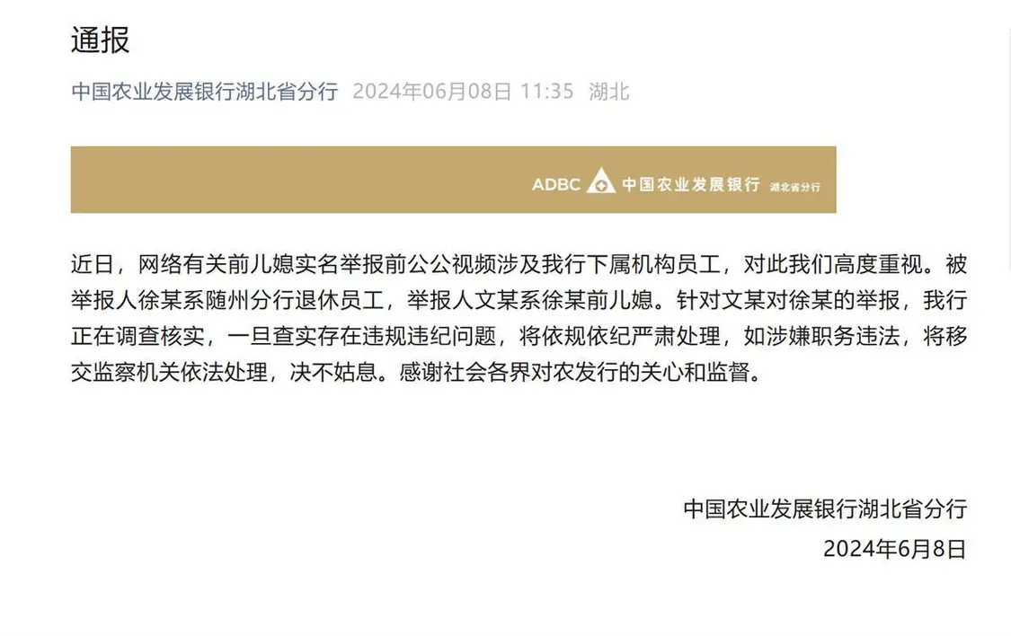 6月8日上午,中国农业发展银行湖北省分行发布通报称:“近日,网络有关前儿媳实名举报前公公视频涉及我行下属机构员工,对此我们高度重视。被举报人徐某系随州分行退休员工,举报人文某系徐某前儿媳。针对文某对徐某的举报,我行正在调查核实,一旦查实存在违规违纪问题,将依规依纪严肃处理,如涉嫌职务违法,将移交监察机关依法处理,决不姑息。”