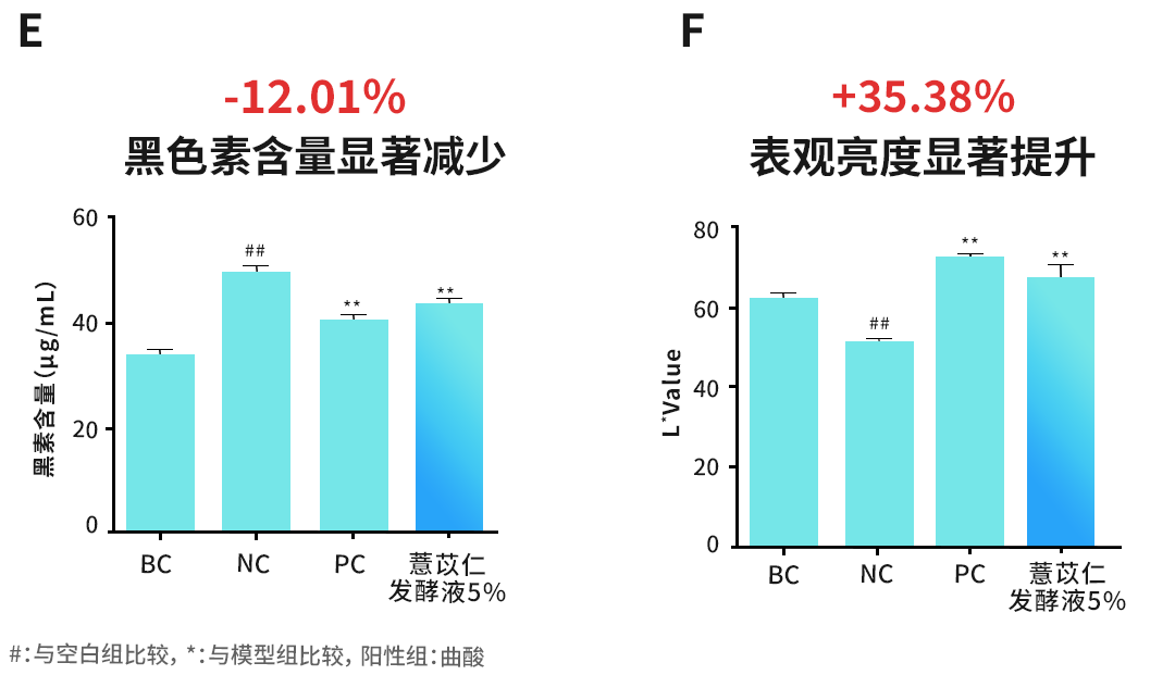 完美研发中心研究结果显示,薏苡仁发酵液在3D黑素细胞模型中能显著降低黑色素含量,并显著提高其表观亮度和表观色度 (图E-G)。