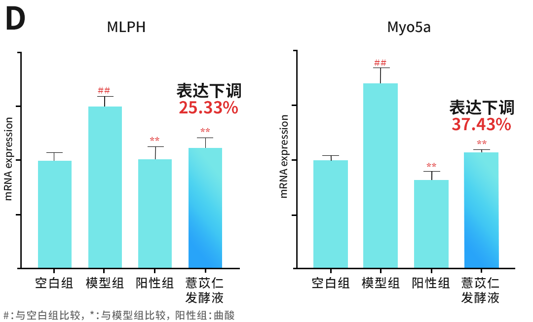 完美研发中心研究数据显示,薏苡仁发酵液能显著下调黑素小体转运蛋白 MLPH 和Myo5a的基因表达量 (图D),从而抑制黑素小体向树突状细胞的运输,阻止黑色素转移到表皮。