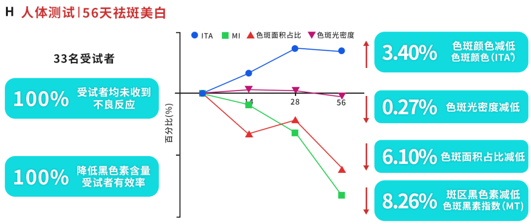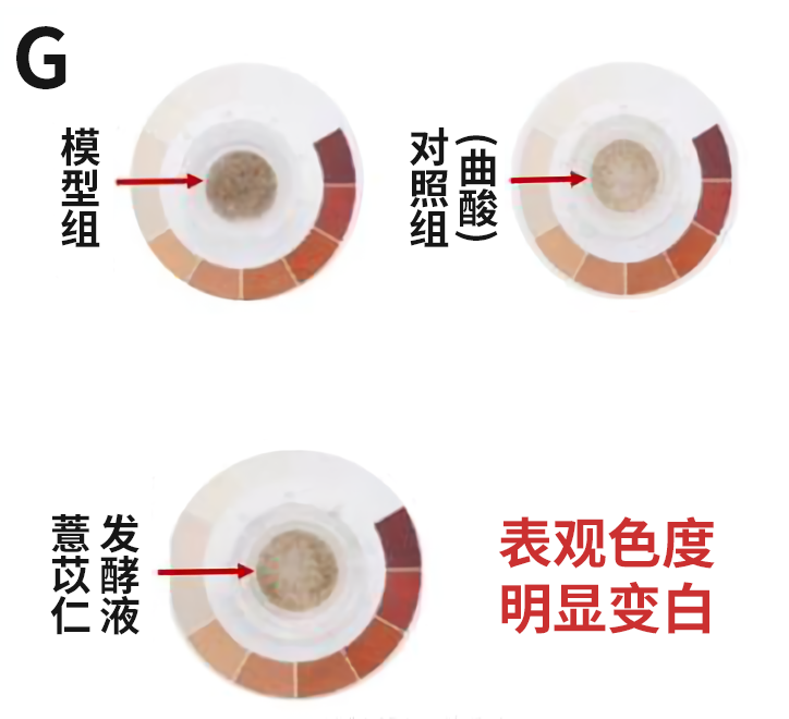 进一步研究发现,在祛斑美白人群实验 (56天) 中,薏苡仁发酵液能降低人脸的色斑颜色 (ITA°)、色斑光密度和斑区黑素指数 (MI),加速已形成黑色素的代谢,并降低色斑面积占比,具有祛斑美白功效 (图 H)。