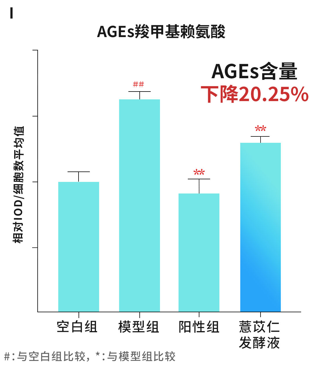 完美研发中心研究结果显示,薏苡仁发酵液能显著降解糖化蛋白,减少晚期糖基化终末产物 (AGEs) 的积累 (图I),具有抗糖化、祛黄效果。