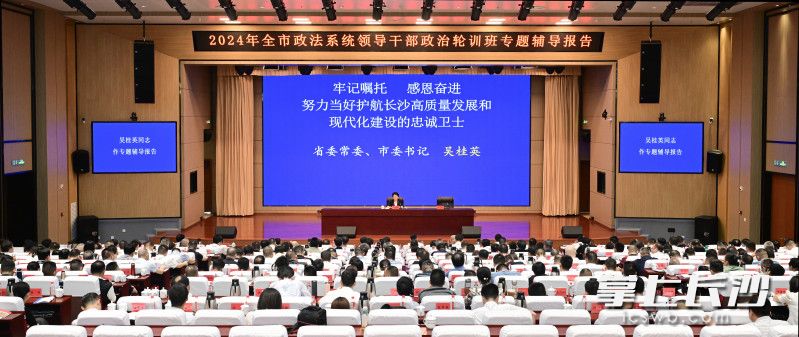7月8日上午,长沙市政法系统领导干部政治轮训班开班。湖南省委常委、长沙市委书记吴桂英出席开班式并作专题辅导,强调要坚持以习近平新时代中国特色社会主义思想为指导,全面贯彻习近平总书记关于政法工作的重要论述精神,锚定“三高四新”美好蓝图,坚定不移防风险、保安全、护稳定、促发展,纵深推进政法工作现代化,为奋力谱写中国式现代化长沙篇章提供坚强保障。