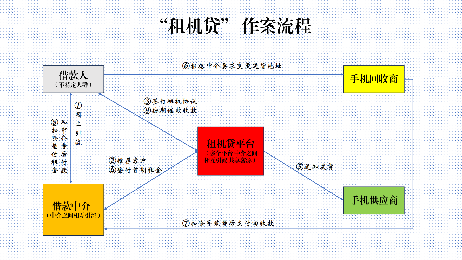 经查,犯罪嫌疑人戴某于2023年10月购入一款非法租机APP,并伙同吴某等人开始非法放贷,由戴某负责运营APP平台、与客户线上签订租机协议并采购、出租手机,吴某等中介人员则负责寻找、推荐客户并指导客户将手机套现,实现手机在“平台—承租人—市场”之间的流转,最终完成变相放贷行为,其中产生的手机价值2倍的高额租金以及回收差价、中介费用等均由承租人承担,年化利率超过400%。截至案发,“芒果商城”已与近百人签订租机协议,涉案金额近160万元。
