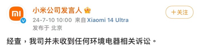 7月10日,小米公司发言人官博发文称,经查,小米公司并未收到任何环境电器相关诉讼。
