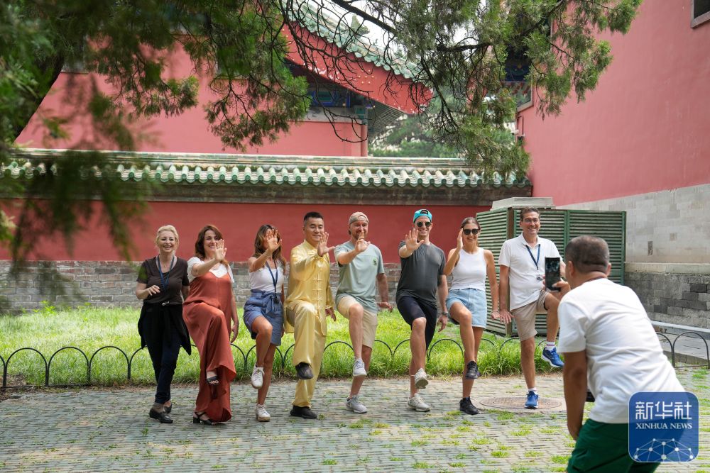 7月9日,来自意大利的游客在北京天坛公园体验太极拳后合影留念。