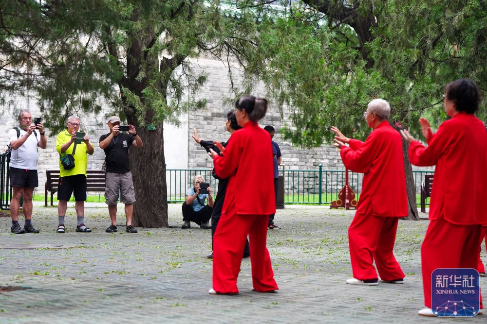 7月2日,来自捷克的游客在北京天坛公园拍摄打太极拳的市民。