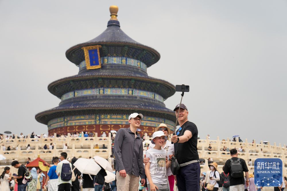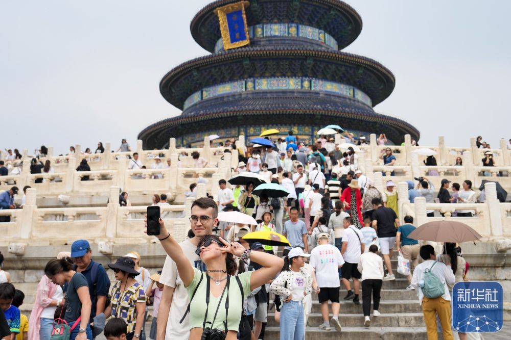 7月9日,两名外国游客在北京天坛公园祈年殿前自拍合影。