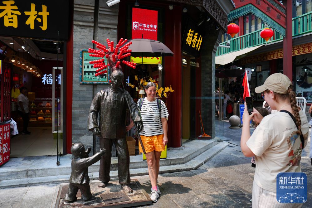 7月10日,两名来自瑞士的游客在北京前门大街拍照留影。