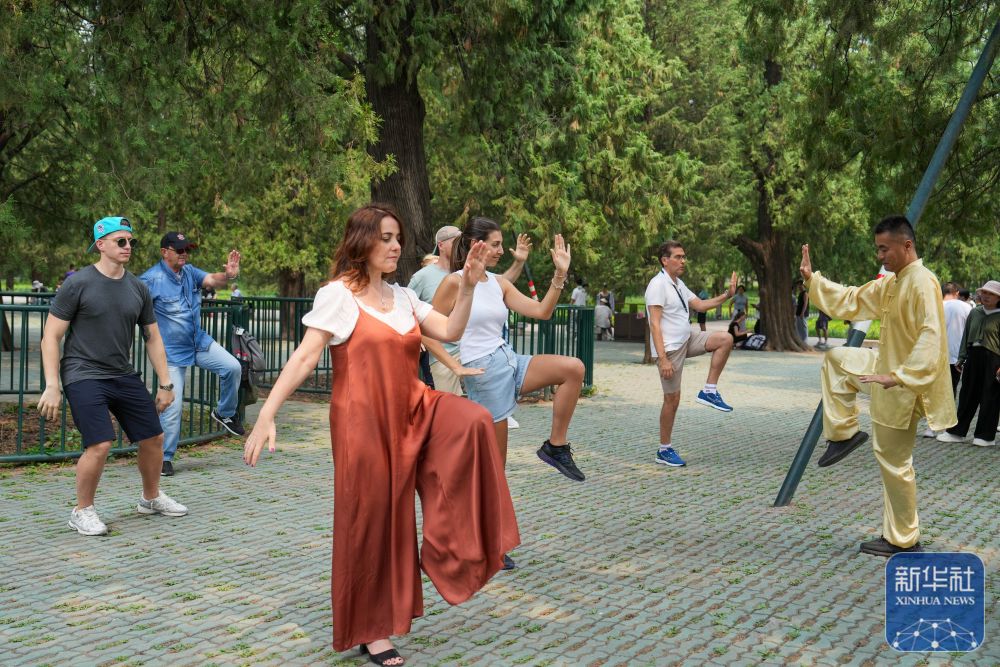 7月9日,几名来自意大利的游客在北京天坛公园体验练习太极拳。
