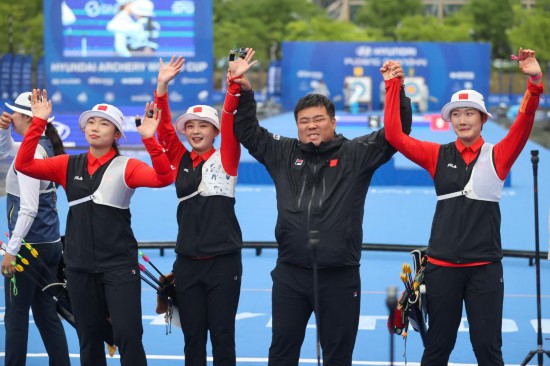 4月28日,在2024射箭世界杯赛上海站女子反曲弓团体决赛中,中国队击败韩国队夺得金牌。新华社记者 王翔 摄