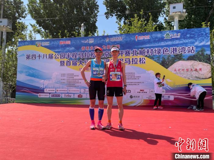 2021年5月,张晓(左)和栾玉帅(右)在第48届公园半程马拉松北京公开赛上合影。受访者供图