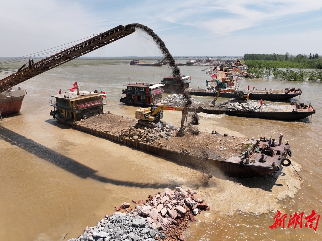 封堵现场,车辆穿梭,机器轰鸣。推土机、挖掘机运转不停,不断推石入湖。决口中心区域,大型驳船满载物料,源源不断抛向水面。