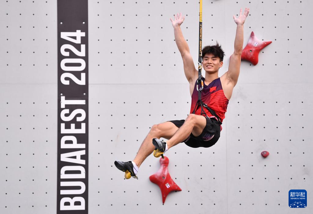 2024年6月22日,在巴黎奥运会资格系列赛布达佩斯站男子攀岩速度赛决赛中,中国选手伍鹏以4秒90的成绩获得冠军。图为伍鹏在决赛后庆祝。新华社记者 连漪 摄