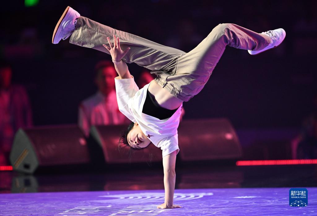 2023年10月7日,在杭州亚运会霹雳舞项目女子组金牌赛中,中国选手刘清漪以2比1战胜日本选手汤浅亚美,获得冠军。图为中国选手刘清漪在比赛中。新华社记者 颜麟蕴 摄