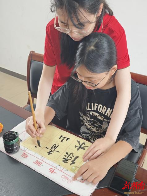 在公益书法展现场,志愿者指导孩子们书写毛笔字。活动最后,常德市青年书法家协会为乡村孩子们赠送了书法作品。
