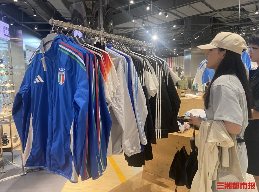 7月16日,在天心区国金中心的阿迪达斯门店内,不少消费者正在选购球衣。从阿根廷国家队队服,到皇马、曼城等俱乐部球衣,纷纷摆放在店内的“C位”。
