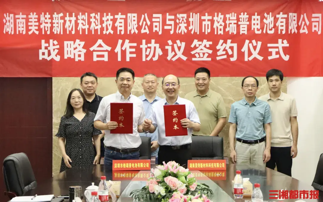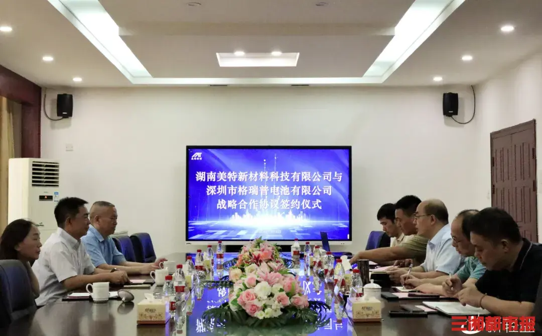 三湘都市报·新湖南客户端7月16日讯(全媒体记者 陈潇 通讯员 代敏)7月16日,深圳市格瑞普电池有限公司(以下简称“格瑞普”)董事、总经理何安轩一行到湖南省轻工盐业集团所属湖南美特新材料科技有限公司(简称“美特新材”)参观考察,双方举行了战略合作协议签约仪式,进一步深化拓展友好合作关系。