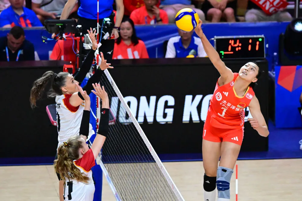 6月14日,中国队球员袁心玥(右)在比赛中扣球。当日,在世界女排联赛中国香港站比赛中,中国队3比0战胜德国队。新华社记者 朱炜 摄