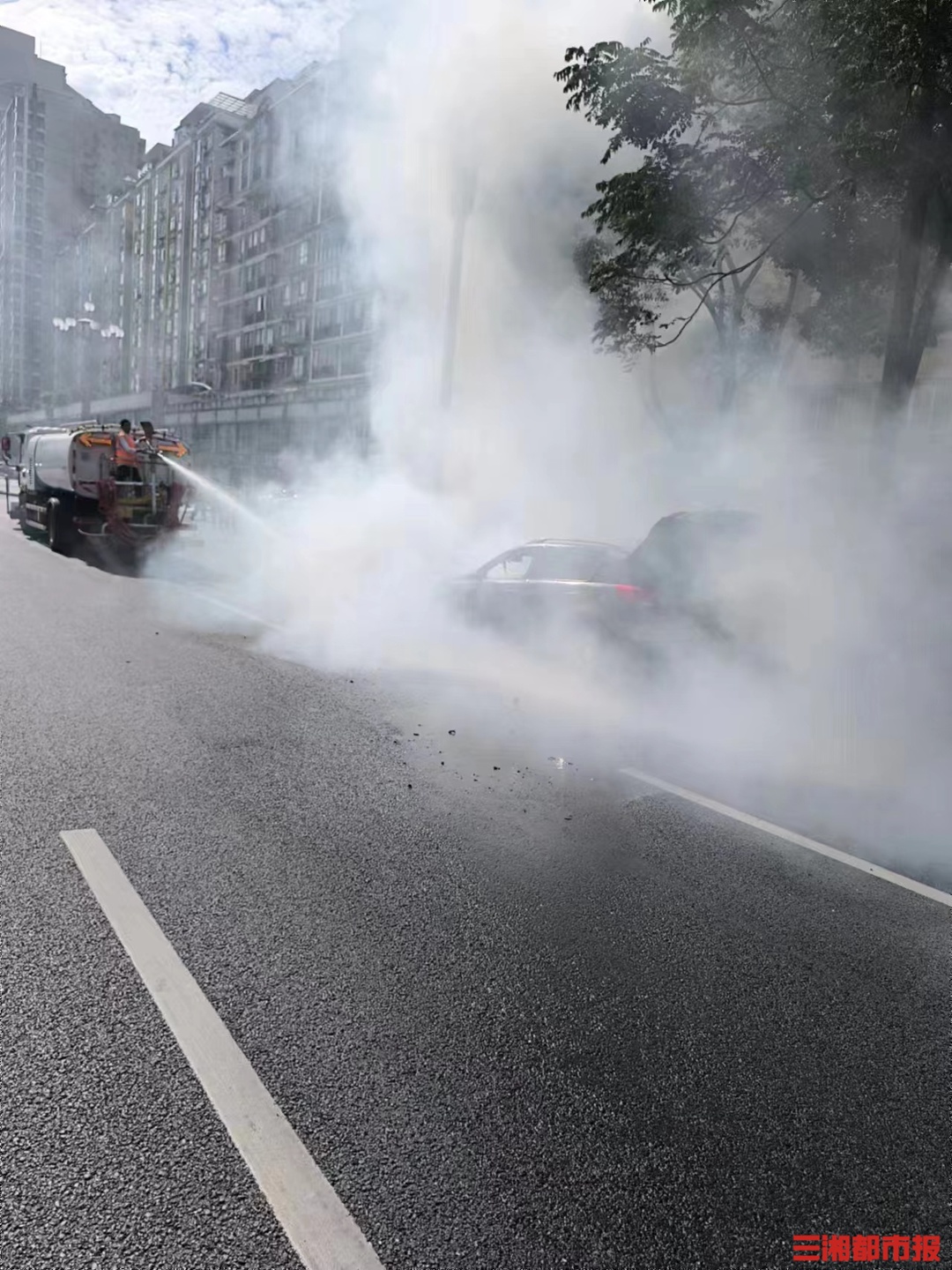 三湘都市报·新湖南客户端7月17日讯(全媒体记者 王智芳 通讯员 胡译丹 刘丽 叶妍)7月17日,高温酷暑,长沙街头一辆小车行驶过程中自燃。危急关头,环卫洒水车出手了。