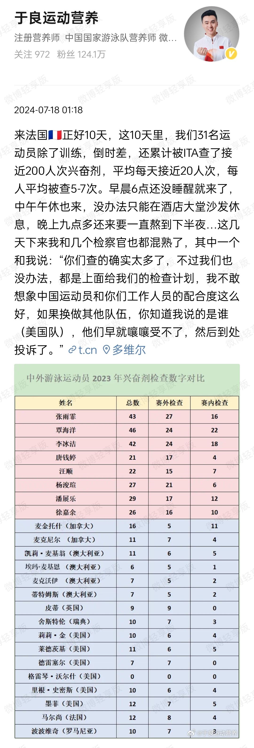 北京时间7月18日,据中国游泳国家队营养师于良发文表示,中国游泳队前往法国10天,全队31名运动员被国际兴奋剂检测组织(ITA)查了近200次。