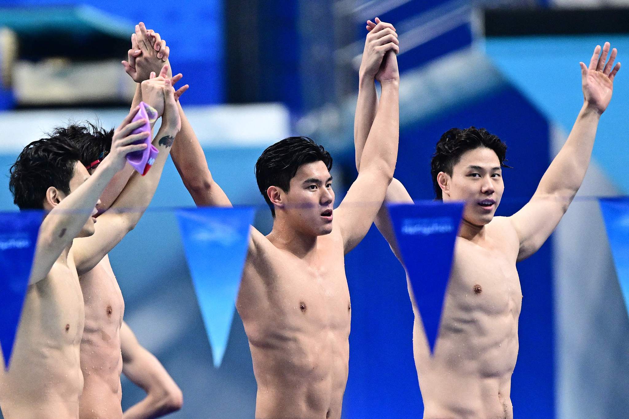 杭州亚运会男子4x100米混合泳接力决赛,中国队破亚洲纪录夺冠。徐嘉余、覃海洋、王长浩、潘展乐在庆祝胜利。