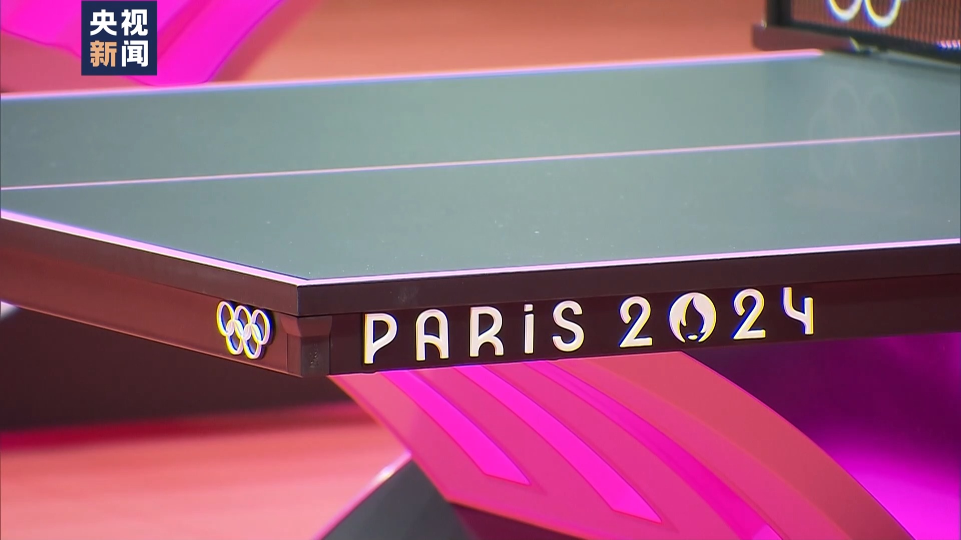 画面中的4张球台,就是将在2024年巴黎奥运会上使用的同款球台。球台以黑色为主调,粉色为配色,采用了彩虹状曲线底座。球台采用自带芯片的可变灯光系统,能呈现彩色灯光,在运动员出场和赛后,营造出独特氛围。
