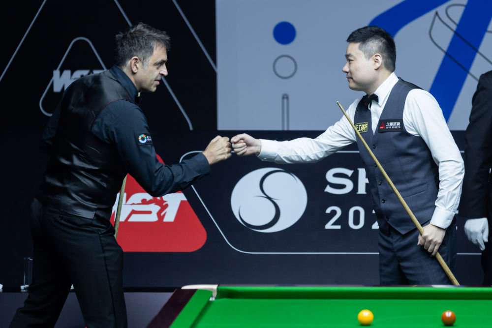 ↑丁俊晖(右)和奥沙利文在赛前致意。