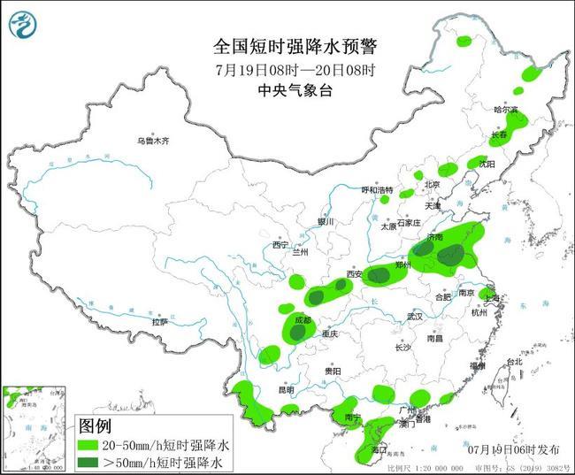 中央气象台7月19日06时继续发布强对流天气蓝色预警: