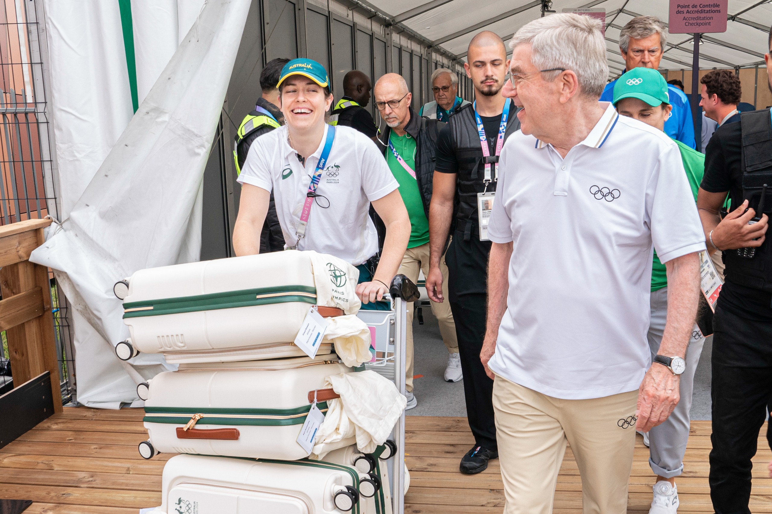 国际奥委会主席巴赫(右)欢迎运动员入住巴黎奥运村