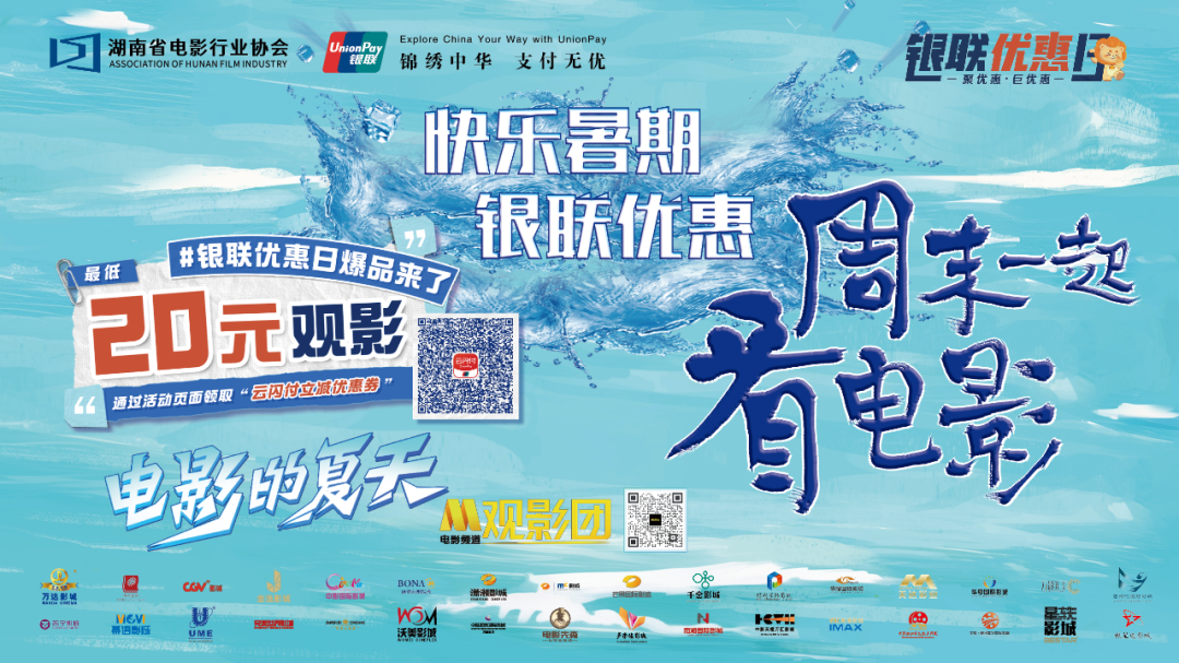 湖南日报·新湖南客户端7月19日讯(邓正可)为进一步激发电影市场消费活力,7月20日至8月31日,湖南省电影行业协会、中国银联湖南分公司联合电影频道M观影团将共同推出“快乐暑期 银联优惠 周末一起看电影”活动,送出“云闪付立减优惠券”,让观众实现最低20元观影。