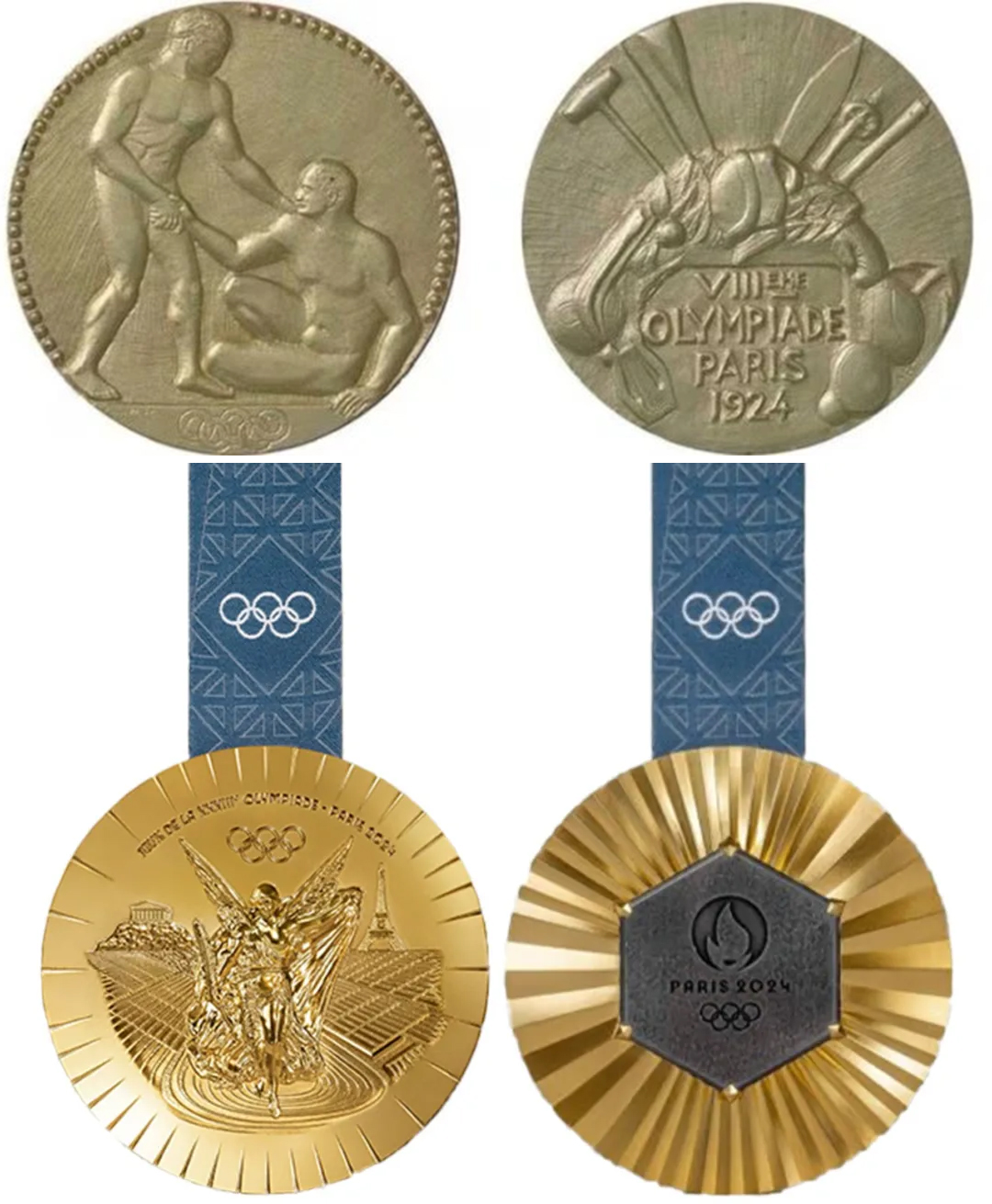 · 2024年巴黎奥运会奖牌设计的最大亮点是,中间镶嵌了一块取自埃菲尔铁塔的原始建造材料,切割成象征法国国土轮廓的六边形;奖牌另一面中间为胜利女神像与举办过首届现代奥运会的帕纳辛奈科体育场,左右两侧分别刻有希腊的标志性建筑雅典卫城以及法国的标志性建筑埃菲尔铁塔。