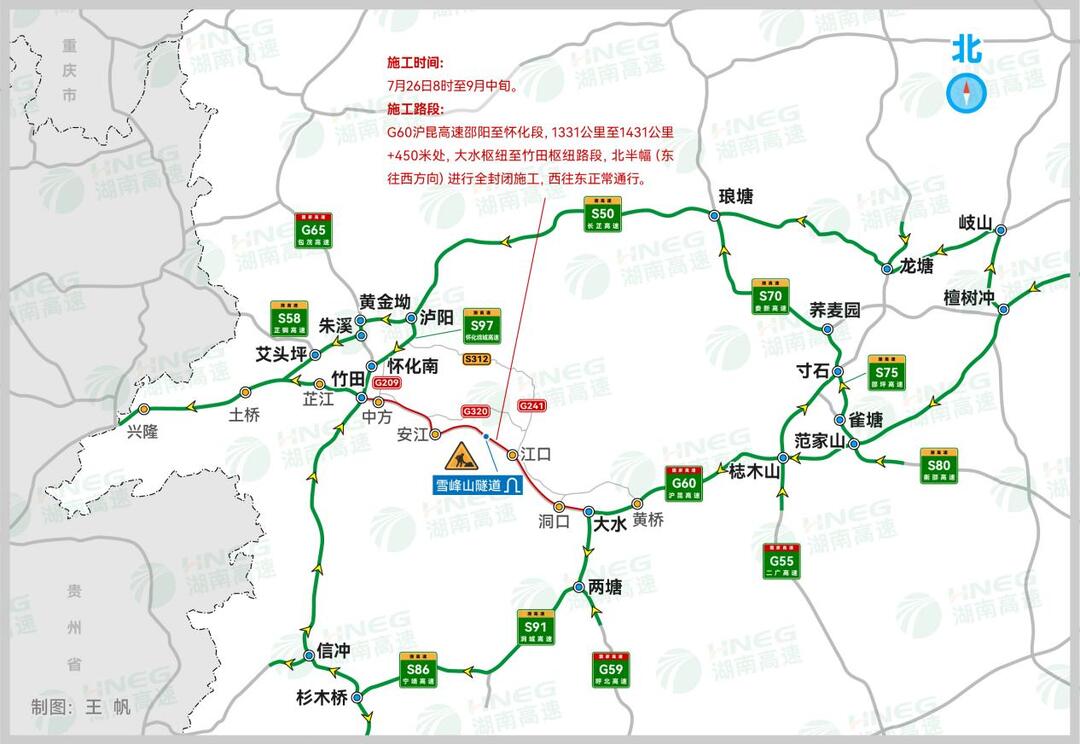 7月26日8时至9月中旬对G60沪昆高速邵阳至怀化段,1331公里至1431公里+450米处,大水枢纽至竹田枢纽路段,北半幅(东往西方向)进行全封闭施工,西往东方向正常通行。